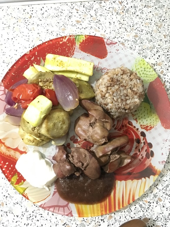 Обед овощи,печень,греча,сметана