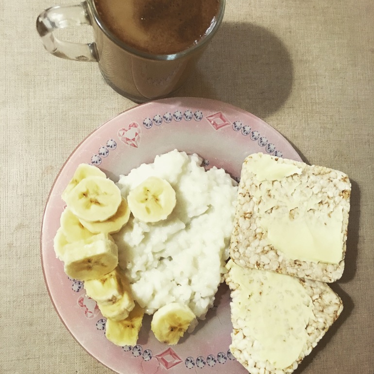 Завтрак каша рис,хлебцы,масло ,банан,кофе