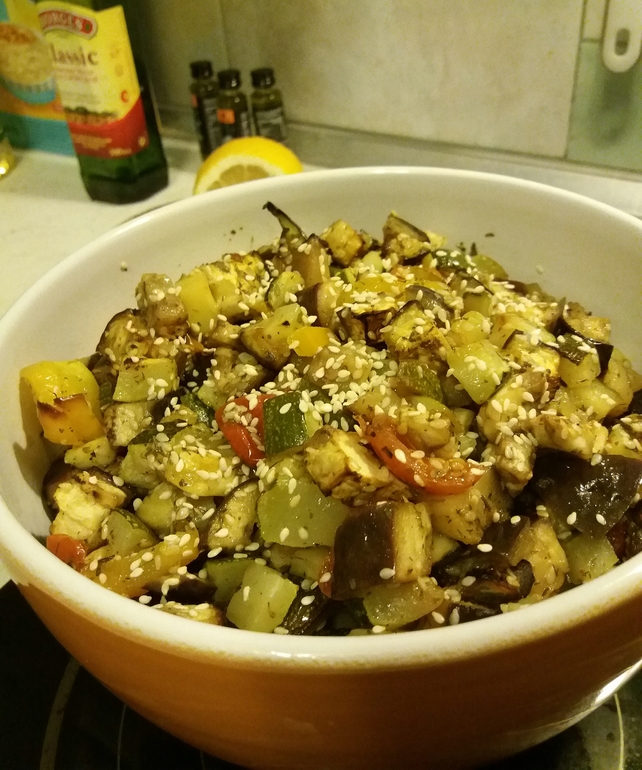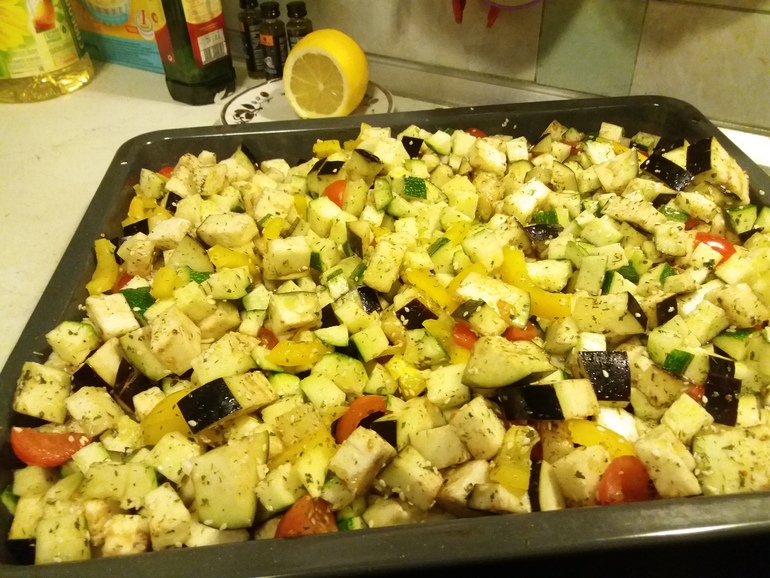 2баклажана, 2 кабачка, помидорки чери, болгарский перец (можно и картошку в более кал орийном варианте)- все режу кубиками посыпаю сухими прованскими травами или сухой кинзой, сельдереем, укропом. Добавляю измельченный чеснок, соль, оливкое или любое другое масло, перемешиваю и в духовку на 35-45 мин. t200-170, режим гриль( можно и без него). В конце посыпаю кунжутом, можно брынзу добавить и все🤗