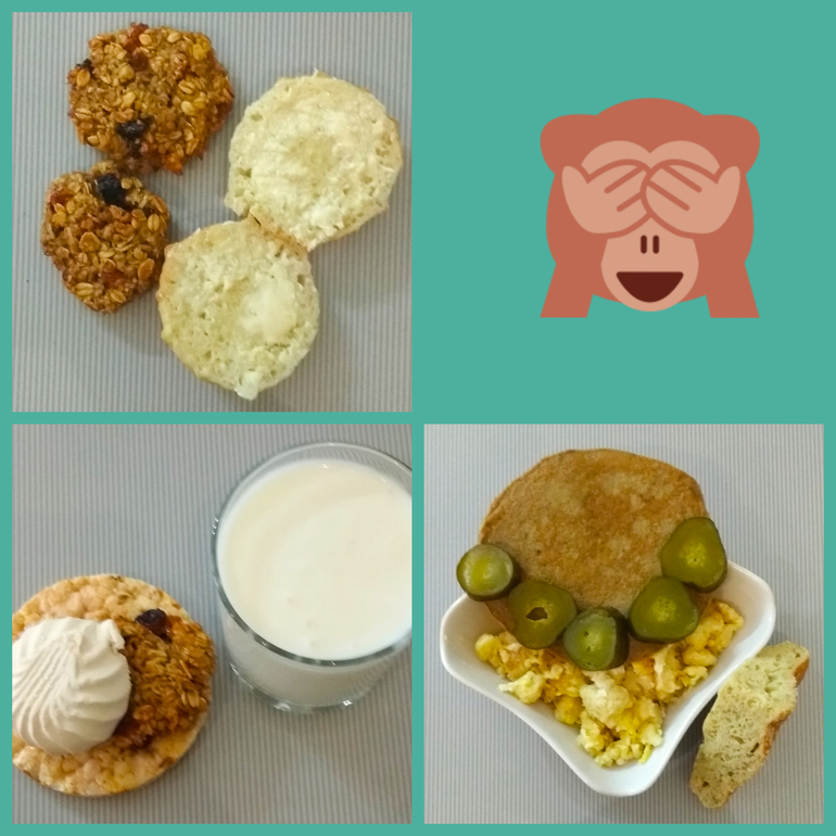 Завтрак - хлебушек с маслом, овсяные печеньки с сухофруктами, кофе с молоком и....доела за сыном манку