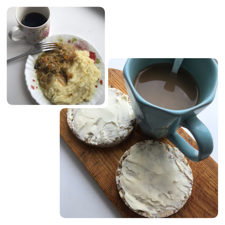 Перекус - кофе и хлебец с маслом (на фото их два, один мой второй для мелкого)