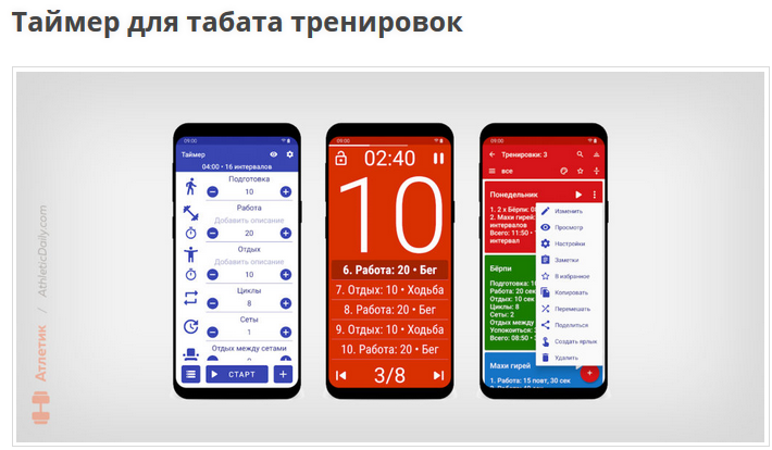 - Соблюдайте время интервалов. Ставить таймер на телефоне неудобно, поскольку постоянно придётся запускать его снова. Используйте бесплатные спортивные таймеры, где можно выбрать количество сетов или раундов.