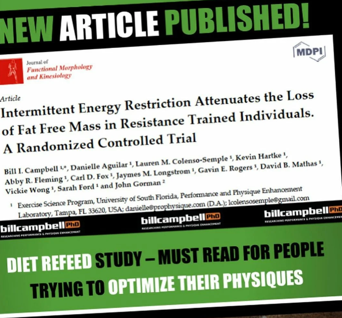 Совсем недавно Бил Кемпбелл с коллегами провели интересный эксперимент (рис 1). У них было 2 группы: одни ели «-» 15% калорий в течении 7 недель, другие если «-» 25% за 5 дней, и поддержка на 2 дня (т.е. в выходные то количество еды, при котором человек не худеет/не толстеет). В итоге, обе группы скинули одинаковое количество веса, только вот жира потеряла больше 2-я группа, когда как в группе «-» 15% было потеряно больше мышц (0.4 против 1.4 минус по мышцам). Везде было 1.8 белка, в выходные группа -25% добавляла калории из углеводов, а дефицит калорий по цифрам был идентичный.