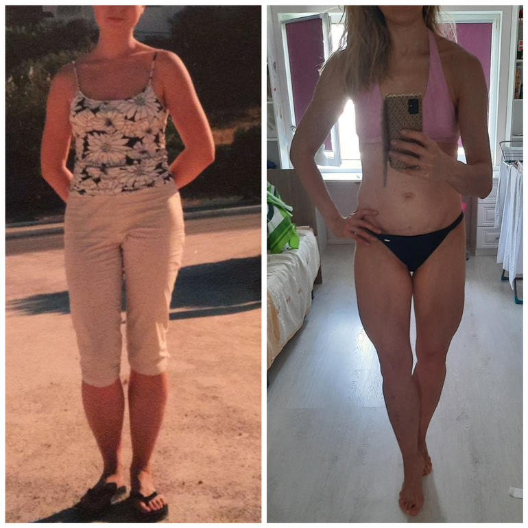 Честно говоря на фото "до" я не вижу ничего критичного. Разница в пару кг. Просто тогда все так одевались: эти капри белые, которые резали ноги в неподходящем месте, полнили бедра, икры, топы непонятной формы и длины... Но Вам респект за такую форму "после", учитывая наличие детей и возраст наверняка не 20 лет?