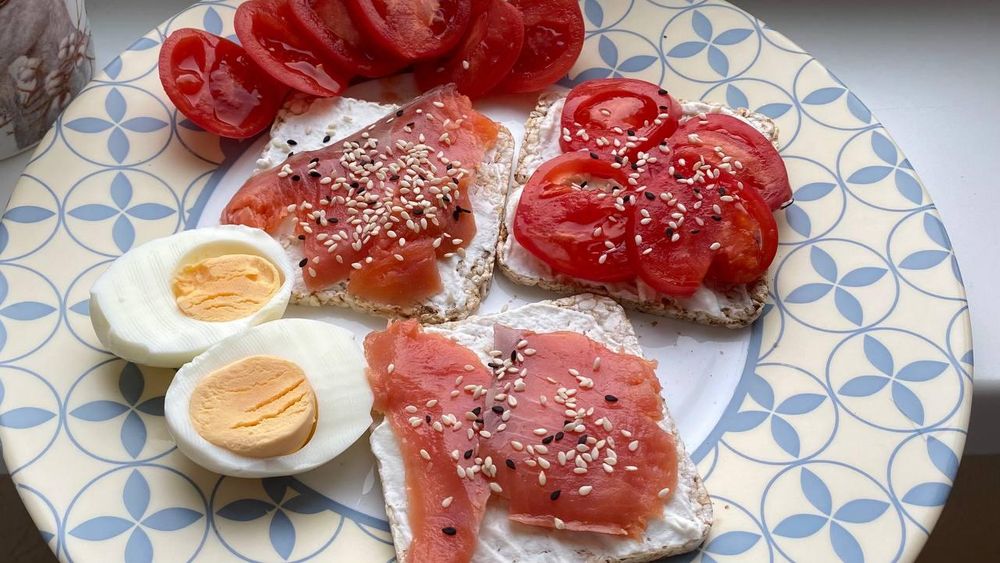 Перекус: яйцо + хлебцы с рикоттой, кетой и помидором