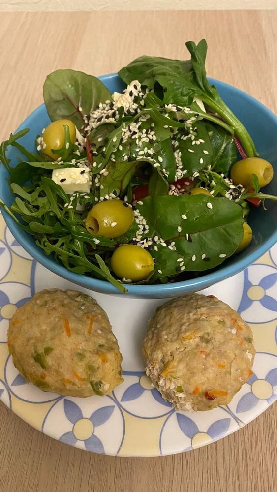 Ужин: котлетки из индейки + салат с овощами, сыром, оливками и маслом.