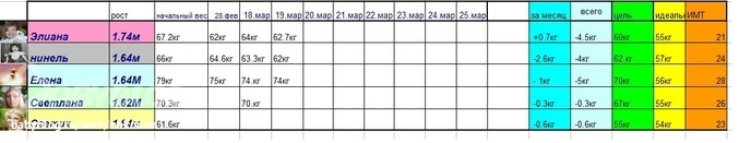 вот честно мне без тебя как то даже скучно,у нас с тобой хоть вес и идеал достаточно близкие и для меня стимул тебя догнать т.к. у тебя вес на 4 кг меньше.