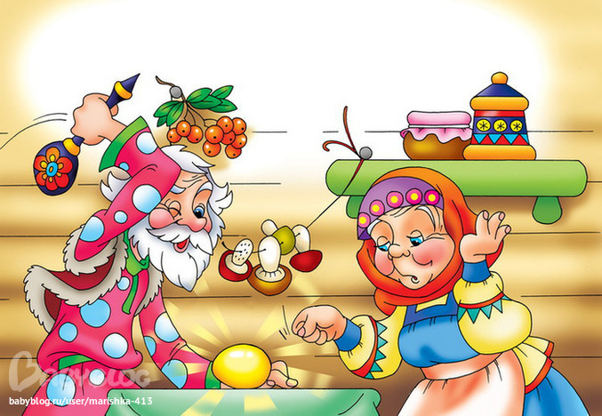 Жили старик со старухой. И была у них курочка рябушечка стара старушечка. Снесла яичко в сенцах на полке, на ржаной соломке. Откуда мышка ни взялась, расколола это яичко.