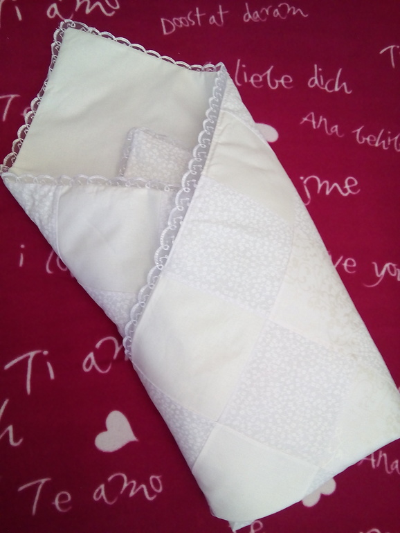 Представляю вашему вниманию очень нежное,белое одеяло - конверт на выписку или для прогулок. Наполнитель - холлофайбер, размер - 100х100 см. Стоимость: 1300руб.В подарок - мягкая текстильная коробочка для детских принадлежностей.