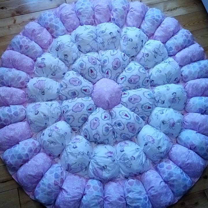 Вот такой круглый бомбон я сшила для игр на полу. Наполнитель холофайбер. По затратам уложлась в 1300р.Выкройку разработала аж на диаметр 145 см! Теперь шью лежанку для кошки в подарок меньшим диаметром.