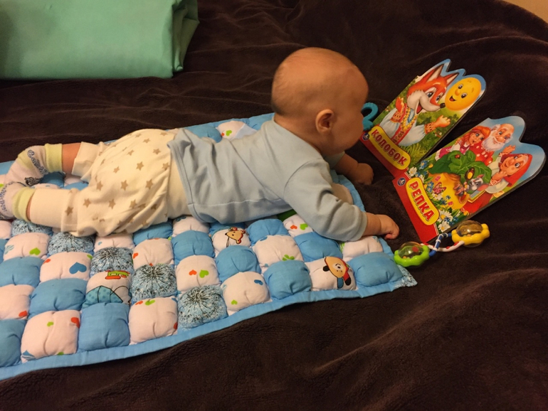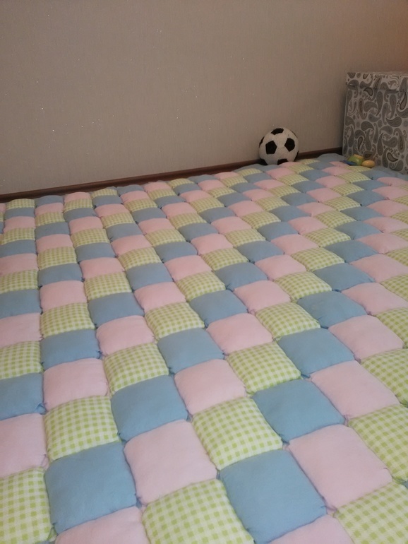 Вот такой коврик, в стиле Бомбон, сшила на рождение внука. До сих пор ему нравится на нем играть и валяться. Продолжаю шить в этой технике, изделия находят своих маленьких хозяев