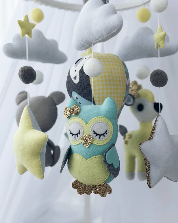 Сошью для вашего малыша мобиль из фетра. Игрушки могут быть любые, на ваше усмотрение, цвет можно подобрать под бортики. Цена 5000р. В комплект входит крестовина с игрушками, музыкальный блок на 1 мелодию, кронштейн для крепления.