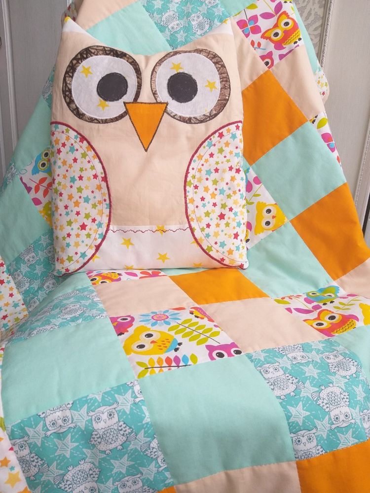 На фото: детское лоскутное одеяло + подушка-игрушка "Совушка". Яркая ручная работа в единственном экземпляре.