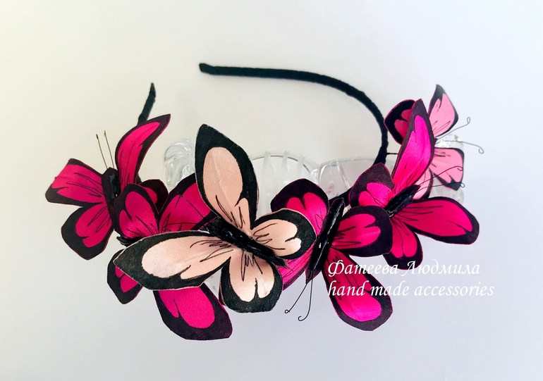 Бабочки выполнены из сатина, расписаны вручную. Обручи в наличии. Возможно изготовление в любом другом цвете, форму бабочек и их рисунок тоже возможно изменить. Срок изготовления 3 дня. Отправка почтой. Цена обруча 1300р. + почтовые расходы.