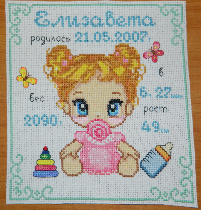 Вы выбираете понравившуюся вам картикну,и я к ней вышиваю имя, дата рождения малыша,его вес при рождении и рост! по желанию могу вышить любую надпись