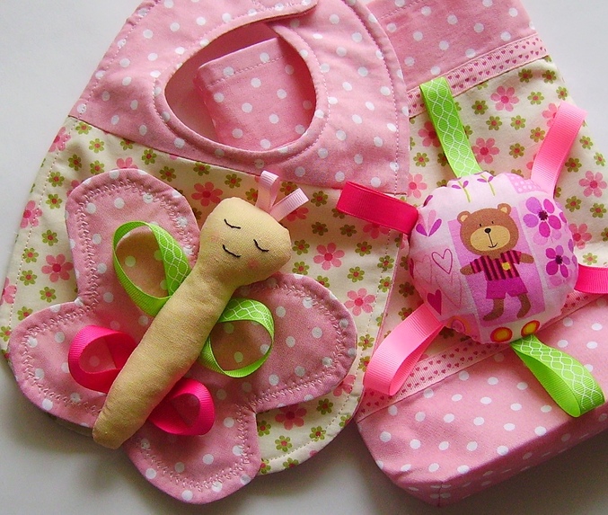 Очень люблю детскую тему-игрушки, погремушки и прочее. А новые наборы немецких тканей просто созданы для детских вещиц. Пошились три наборчика, пока показываю розовый.