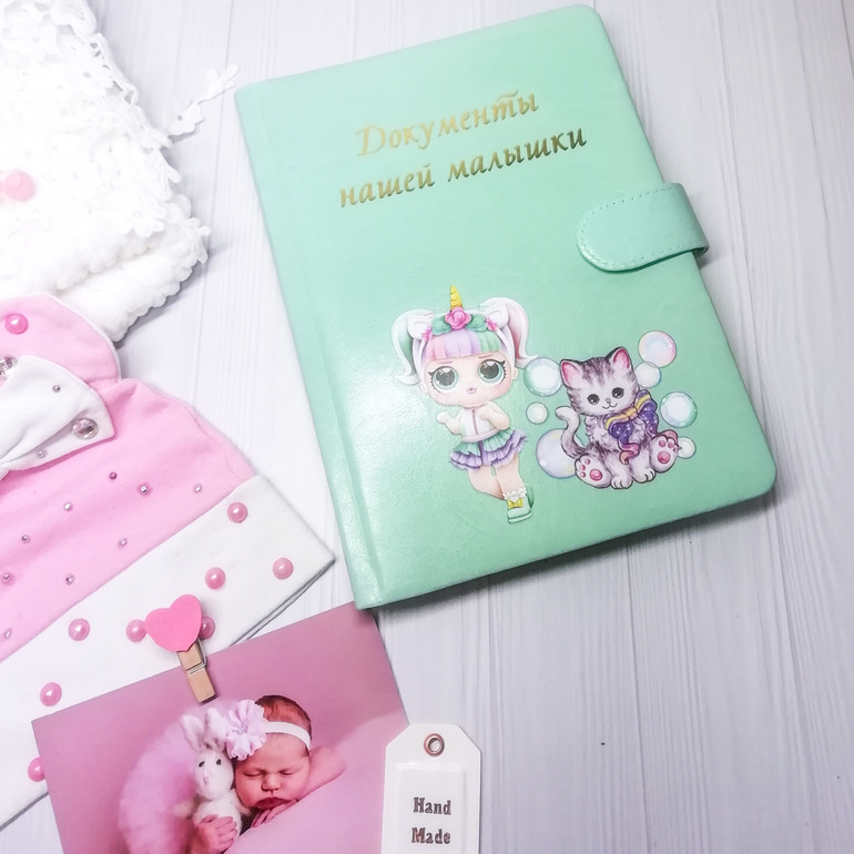 Внутри файл который вместит свидетельство о рождении, снилс, полис нового образца и полис старого образца, по бокам вместительные карманы. На один комплект документов (на одного ребёнка)