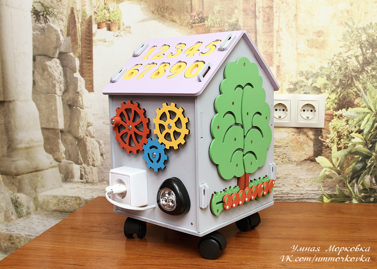 Основа Березовая фанера или щит сосны, наполнение согласуем. Краска без запаха, абсолютно безопасна для детей, покрыто лаком на водной основе, тоже безвредна для малышей. Ниже примеры бизибордов