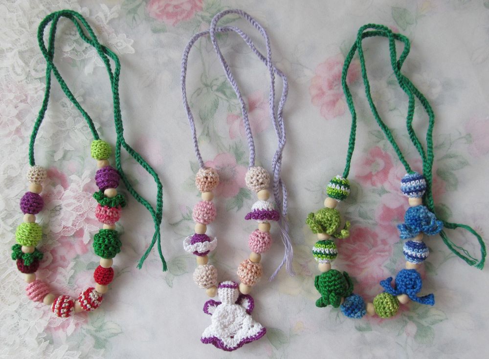Слингобусы из дерева и хлопка. Диаметр бусин 1 - 2 см.