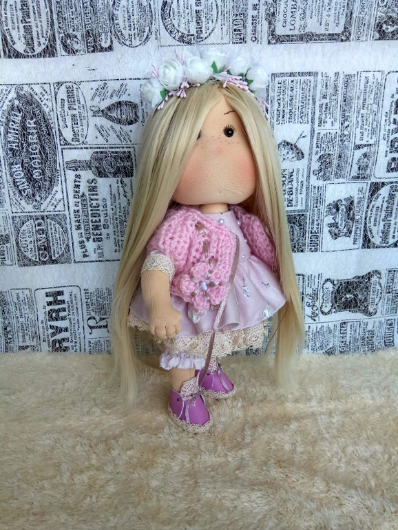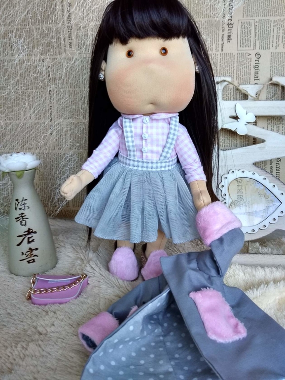 Самостоятельно стоит и сидит.Ручки,ножки и голова подвижные.Одежда вся снимается