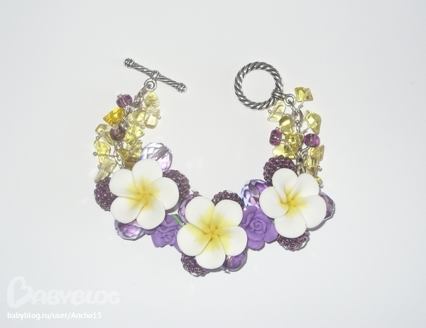 5. Браслет с белыми цветочками. Браслет выполнен из полимерной глины,хрустальной крошки, гранёных бусин и бусин, оплетённых бисером.