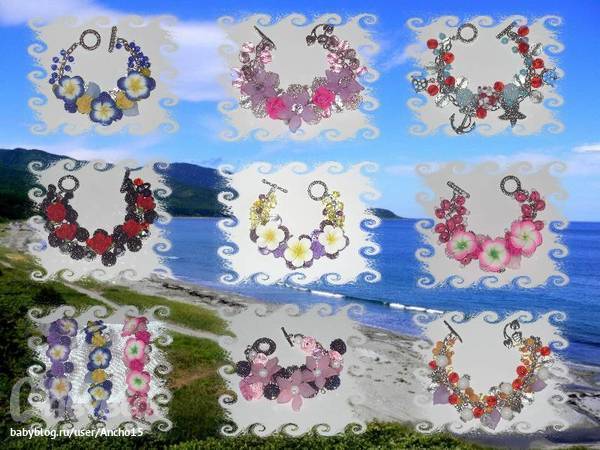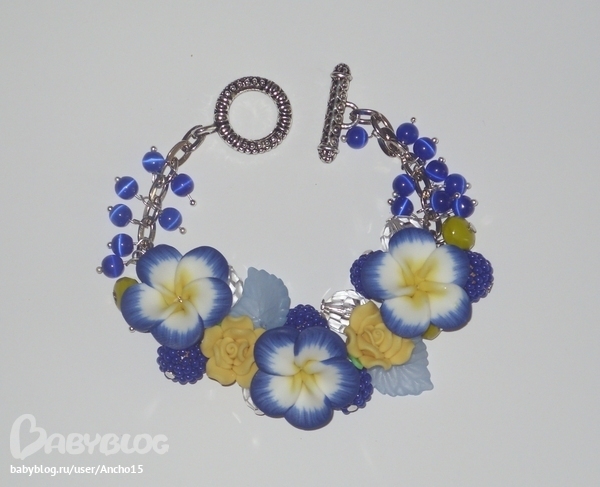 1. Браслет "Синий букет" . Выполнен из полимерной глины, бусин оплетённых бисером, акриловых бусин, бусины кошачий глаз, гранёных бусин и фурнитуры под серебро. Примерная цена 650 руб.