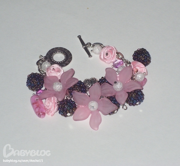 7. Браслет "Розовый букет-1". Нежный букетик на руке. Использовались атласные розочки, акриловые цветы, натуральные камни (кварц, родонит), бусины оплетённые чешским бисером, чешский хрусталь. 590руб.