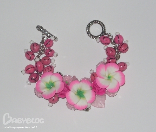 7. Браслет "Розовый букет-4". Выполнен из полимерной глины, бусин оплетённых бисером, акриловых бусин, бусин косточек и фурнитуры под серебро.