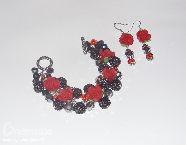 4. Браслет "Ежевики с розами". Выполнен из полимерной глины, гранёных стеклянных бусин, бусин ,оплетённых чешским бисером.