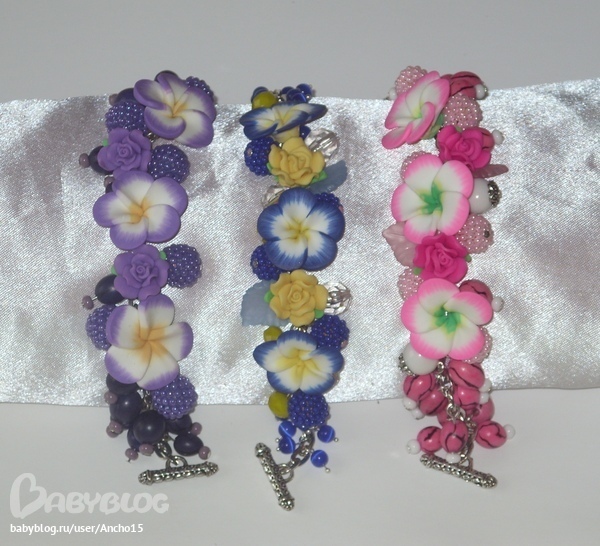 6. Браслеты( Сиреневый, розовый, синий). Выполнены из полимерной глины, бусин оплетённых бисером, акриловых бусин, бусины кошачий глаз, бусин косточек, гранёных бусин и фурнитуры под серебро.