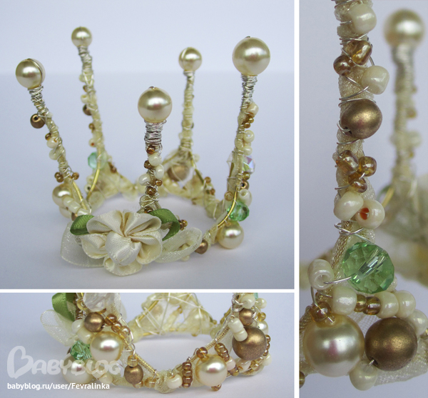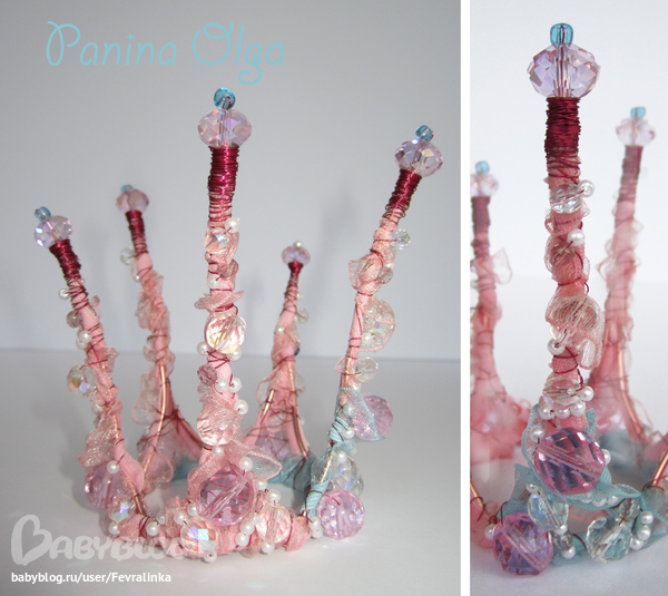 Корона в нежных розовых тонах с преобладанием прозрачных бусин. Очень ажурная.