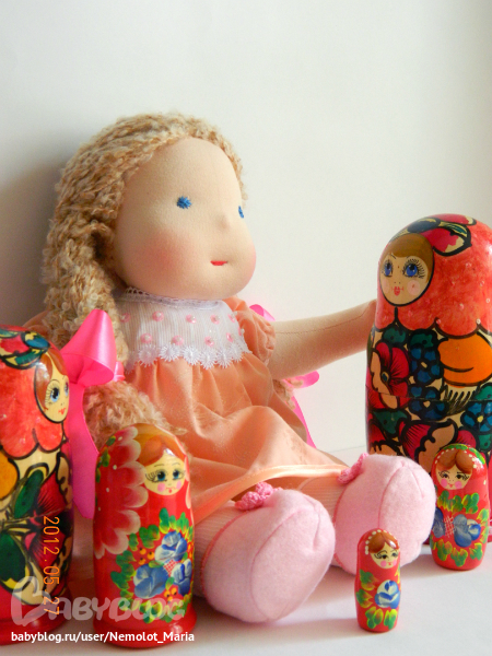 Сама куколка сделана из кукольного трикотажа (Нидерланды), набивка - овечий сливер, волосики - мое любимое итальянское шерстяное букле.