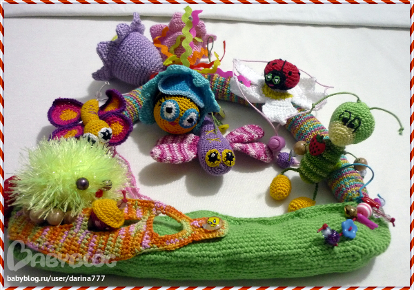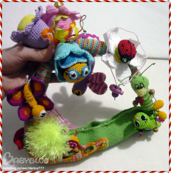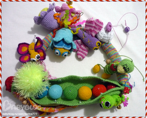 На длинном цветном стебле закреплен кузнечик кузя на спине липучка , " кузя " закреплен резинкой вместе с гусенице которая любит пролазить сквозь фигуры в листочке и прятаться в стручке, а так же у нее забавно бренчат бусины.