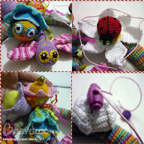 слева, под паучком мы видим паутинку, а если нажать на паучка то он пищит.На стручке с помощью резинки прикреплена ящерица на резинке бубенчики бусины и мелки элементы.