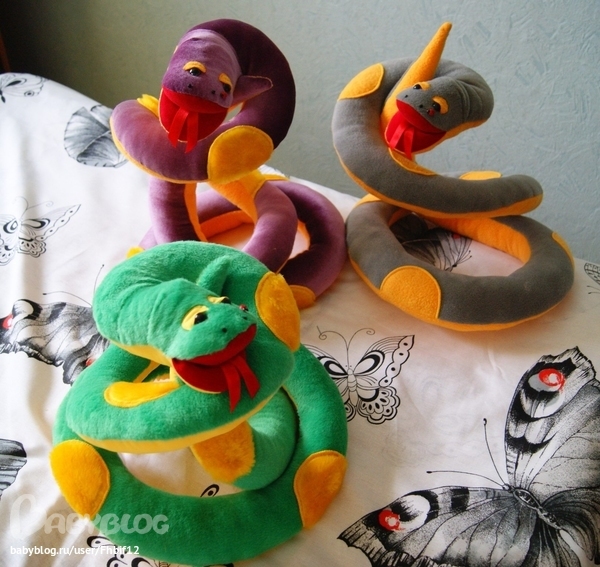 Куклы и игрушкиПродам змейку ручной работы.Авторская игрушка,длинна 2 метра,диаметр 40-45 см,это подушка-игрушка,можно прилечь ребенку или просто с ней играть можно.Можно извивать змейку как хотите..Ткань у серой змейки флис,у зеленой плюш,искусственный мех,габардин,у фиолетовой велюр,наполнитель синтепух.Символ нового года 2013.Могу шить на заказ любую расцветок по вашему желанию.