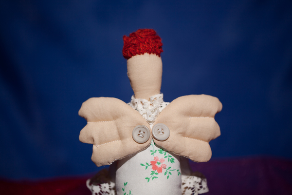 Волосы сделаны из шерстяной пряжи. Руки и крылышки прикреплены на пуговках и двигаются.
