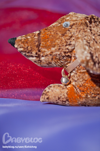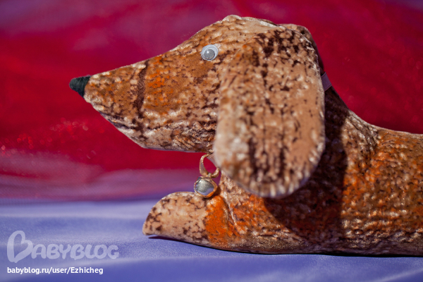 Выполнена игрушка из мягкого материала флок и набита синтепоном. На шее у Таксика "ошейник" из атласной ленты с мелодичным бубенчиком.