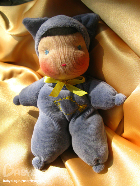 Он очень нежный и смешливый. Удобен в формате "карманной куколки", с радостью сопроводит своего маленького хозяина на прогулке или в поездке, легко умещается в сумке или кармашке. Росточком он 18 см плюс ушки. Одежда несъёмная. На груди вышита рыбка. Сшит из экологически чистых материалов: хлопковый трикотаж и велюр, набит овечьей шерстью. То есть пригоден для жевания-сосания-целования-обнимания :)