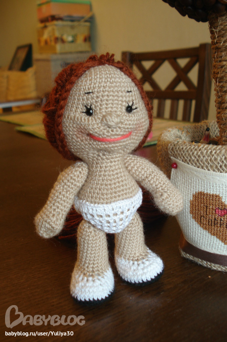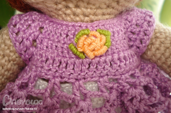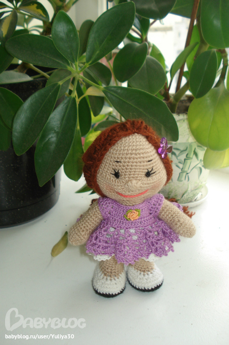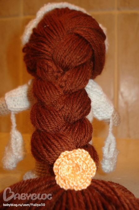 Рост куколки 16 см, связана крючком, состав нити - шерсть с акрилом, наполнитель - силикон, глаза - клеевые стразы. Зимний свитерок связан спицами, сзади застегивается на пуговицы, спереди вышивка-снежинка, варежки пришиты к рукавам свитера, пушистые наушники на проволочном каркасе - вся одежда (кроме трусиков) снимается. Летнее платье связано крючком, сзади застегивается на пуговки, спереди вышивка-роза, подъюбник, цветок-заколка в косе связан крючком, бабочка в волосах из пластмассы.