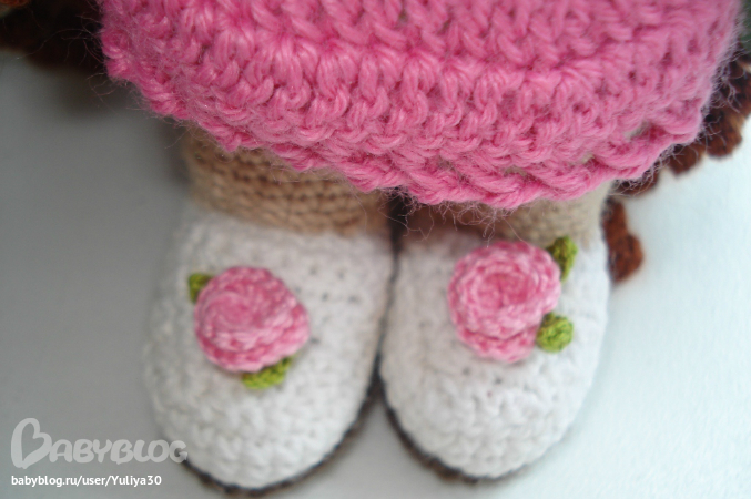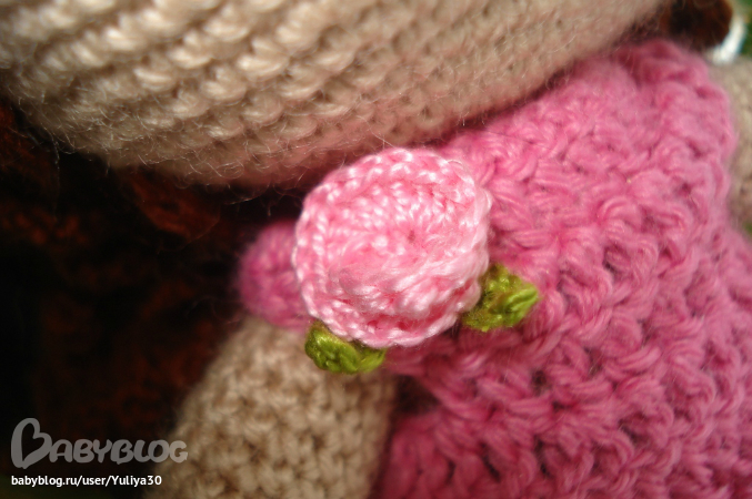 Материал нити - шерсть с акрилом, наполнитель - силикон, глаза-пуговки, брови, ресницы, рот вышиты, платье связано крючком (снимается, сзади на пуговицах), украшения на платье - розы с листочками - связаны крючком из 100% хлопка, волосы можно моделировать по собственному вкусу.