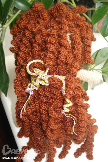 Связана крючком, рост 20 см, без поддержки стоять и сидеть не умеет, зато умеет ласково улыбаться и с радостью, разбросав кудри, уляжется к вам на ладошки)