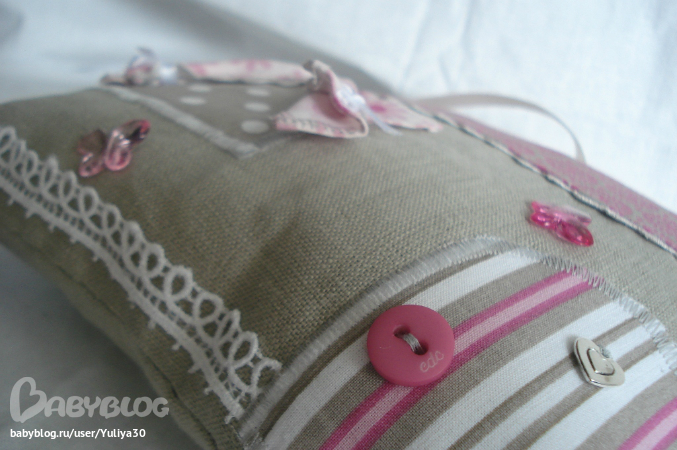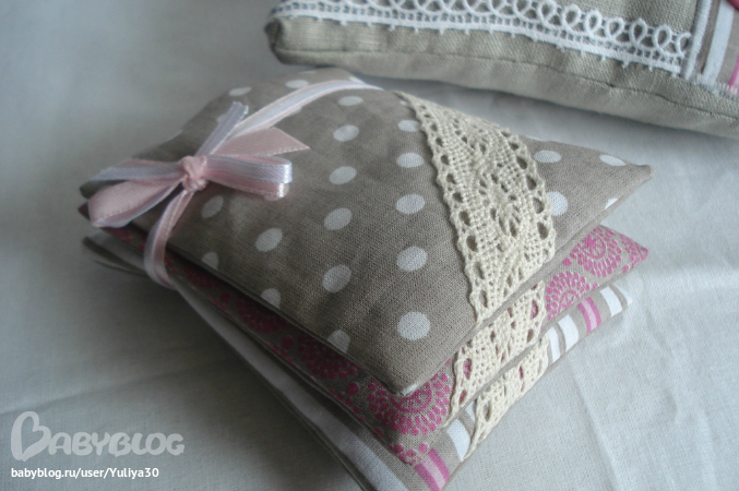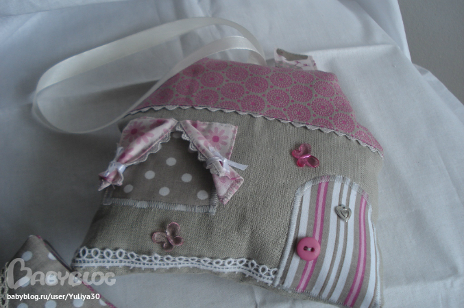 Наполнитель: домика - ситнепух+синтепоновый валик, пропитанный аромамаслом, подушечек - сушеные травы (лаванда, роза, ромашка).