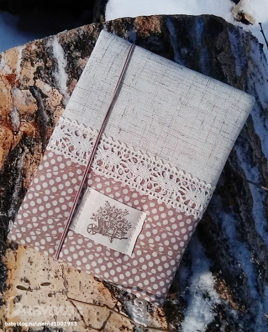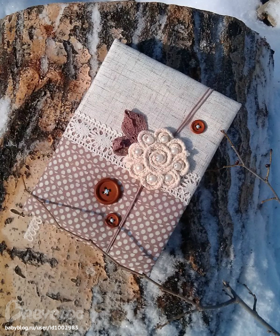 1. Блокнот "Эко". Формат А6, 80 листов (или 160 страниц), страничики состарены в кофе, пропитаны ароматом корицы. Обложка мягкая, комбинированная лен+хлопок. Вязаный цветок, деревянные пуговки, кружево. Закрывается на резиночку, есть закладка. Цена - 1 200р.