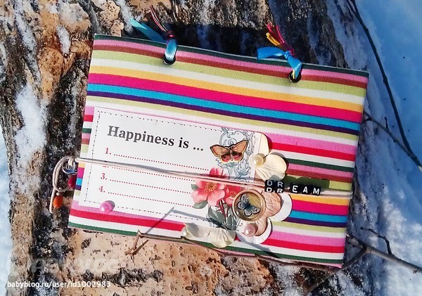 2. "Счастье есть!" Яркий и веселый блокнот для хозяйки-непоседы. Записывайте в него свои мечты и они обязательно сбудутся! Формат А6, альбомная ориентация. Переплет на шнурочках (отверстия под шнуры укреплены люверсами). Закрыватся на оригинальный зажим на вощеном шнурочке. На шнурочек нанизаны бусины со словом "мечта". Внутри крафтбумага. Цена - 800р.