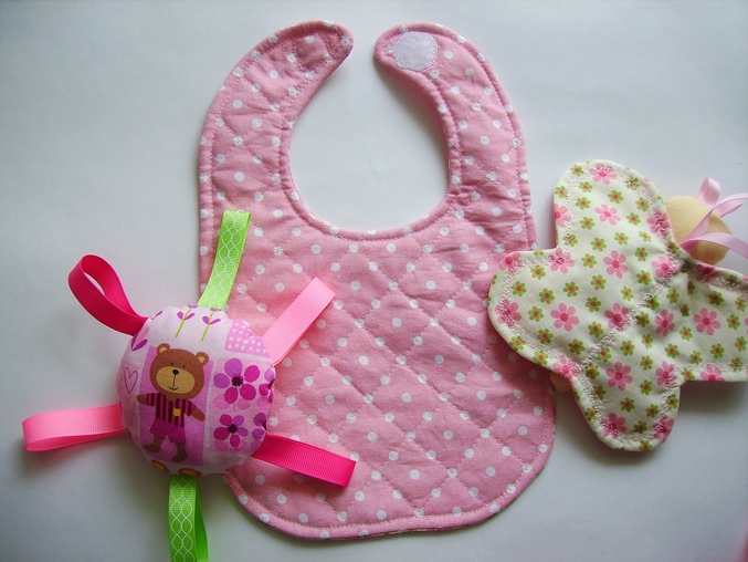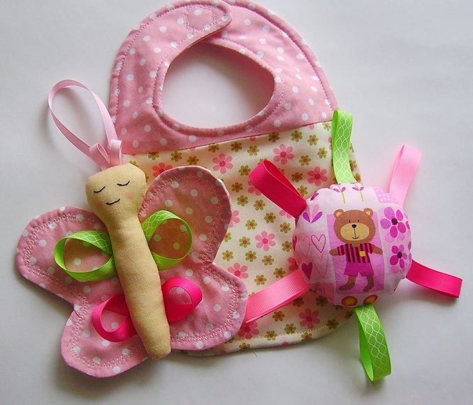 Оригинальные подарки для новорожденых (торты из памперсов и пр.)Очень люблю детскую тему-игрушки, погремушки и прочее. А новые наборы немецких тканей просто созданы для детских вещиц. Пошились три наборчика, пока показываю розовый.