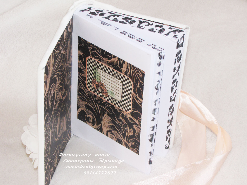 Скрапбукинг (альбомы, открытки и пр.)Книга формата А5,сшита вручную,184 листа белой бумаги плотностью 80 г/м,каптал ручной работы на двух шнурах,обложка обернута белоснежной натуральной кожей,обрез книги разрисован акрилом. Обложка украшена гипсовым ангелом, цветком из органзы. Книга завязывается на атласную ленту.2500 руб плюс пересылка.