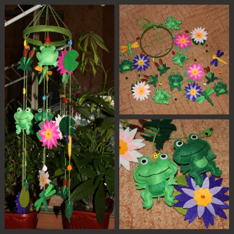 ФетрЯркий и красочный фетровый мобиль-подвестка украсит ваш дом или детскую комнату. Забавные лягушата, стрекозки пархают над камышом и кувшинками))) Цена 1500 р.