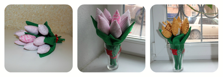 Букет текстильных тюльпанов послужит прекрасным подарком любимым женщинам! Цветы освежат и украсят интерьер Вашего дома или офиса. Внутри стебля, деревянный стержень.