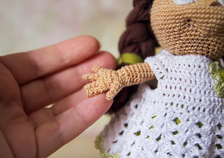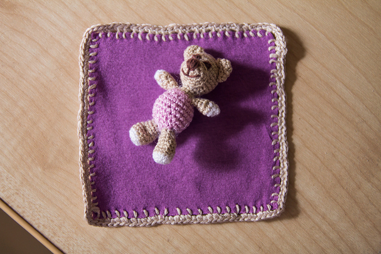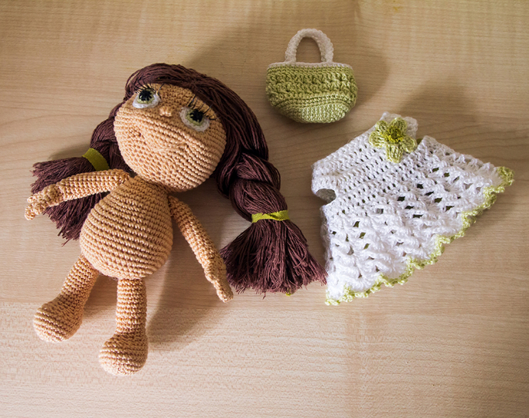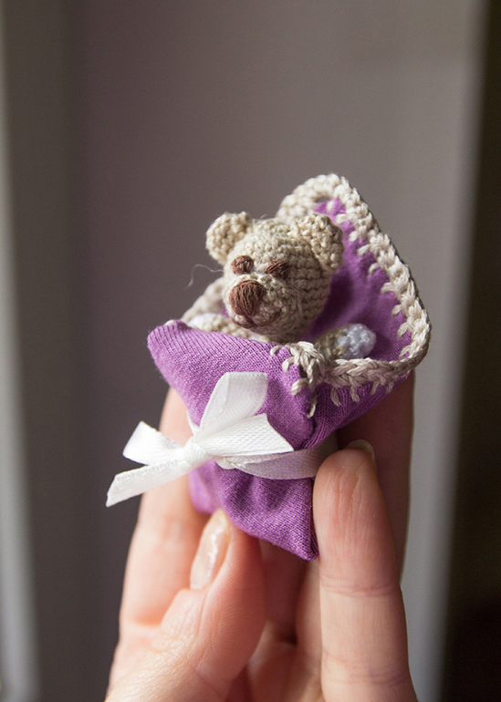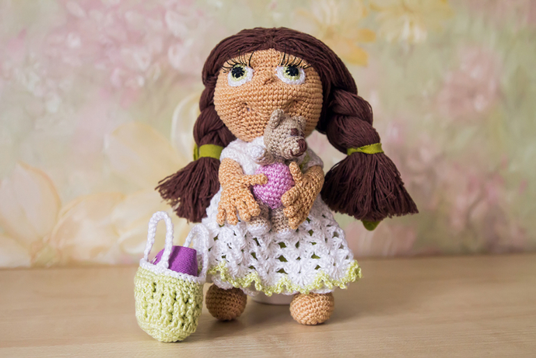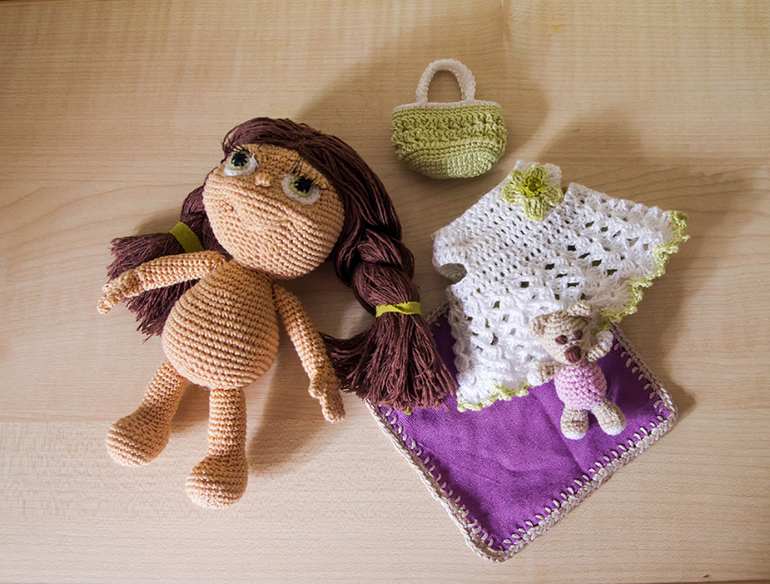 У нее есть маленький сумочка и мишка, которого можно завернуть в одеялко.