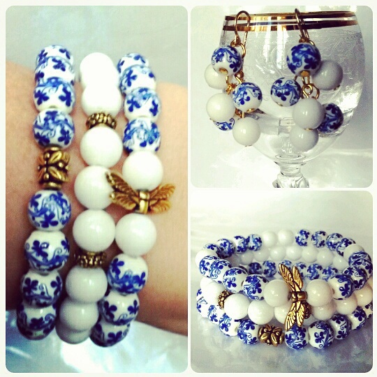Набор "Гжель" (агата, керамика), фурнитура позолоченная. Браслеты-1200, серьги-650